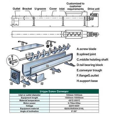 स्टेनलेस स्टील और कार्बन स्टील के शाफ्ट वाले यू प्रकार के स्लाड स्क्रू कन्वेयर और औद्योगिक अनुप्रयोगों के लिए स्टेनलेस स्टील के शाफ्ट रहित कन्वेयर का निर्माता।